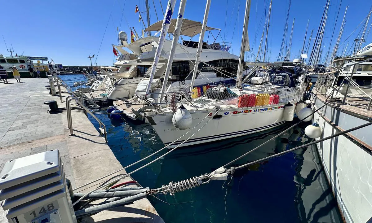 Helpful harbor guards assist you with docking/mooring. Diesel and gasoline are available, but you must use cans that you can borrow from the harbor office. They have an ATV to transport the cans to the boat. Well-protected harbor with two breakwaters. Little swell even when there were 2-3 meter waves outside. Power and water available on the quay. You need to use an adapter cable. These are for sale or can be rented for €25.